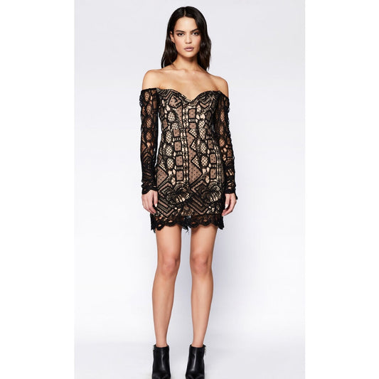 BARDOT Women's Zendaya Mini Lace Dress Large Black Nude Off Shoulder NWT