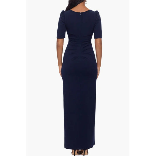 XSCAPE Women's Ruched Scuba Ruffle Gown Size 8 Midnight Blue 3/4 Sleeves NWT