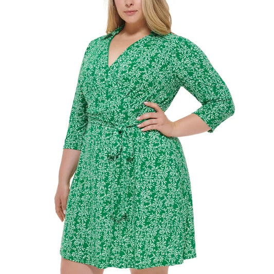 JESSICA HOWARD Faux Wrap Dress 14W Green Printed 3/4 Sleeve NWOT