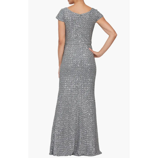 ALEX EVENINGS Sequin Scoop Neck Gown Size 16 Silver Gunmetal Cap Sleeve NWT