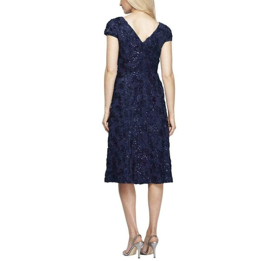 ALEX EVENINGS Rosette A-line Midi Dress Size 14 Navy Blue Sequin Lace 121570 NWT