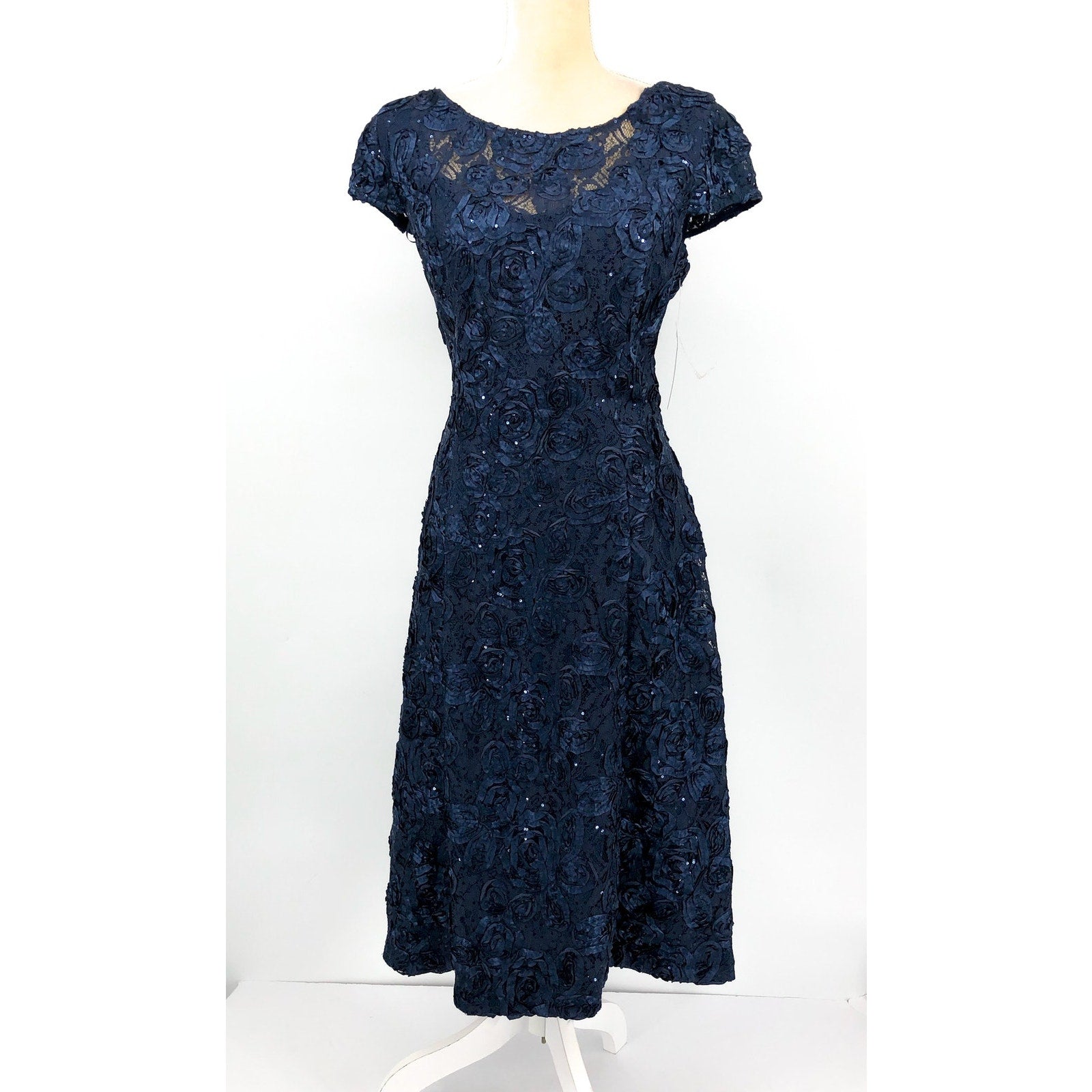 ALEX EVENINGS Rosette A-line Midi Dress Size 14 Navy Blue Sequin Lace 121570 NWT