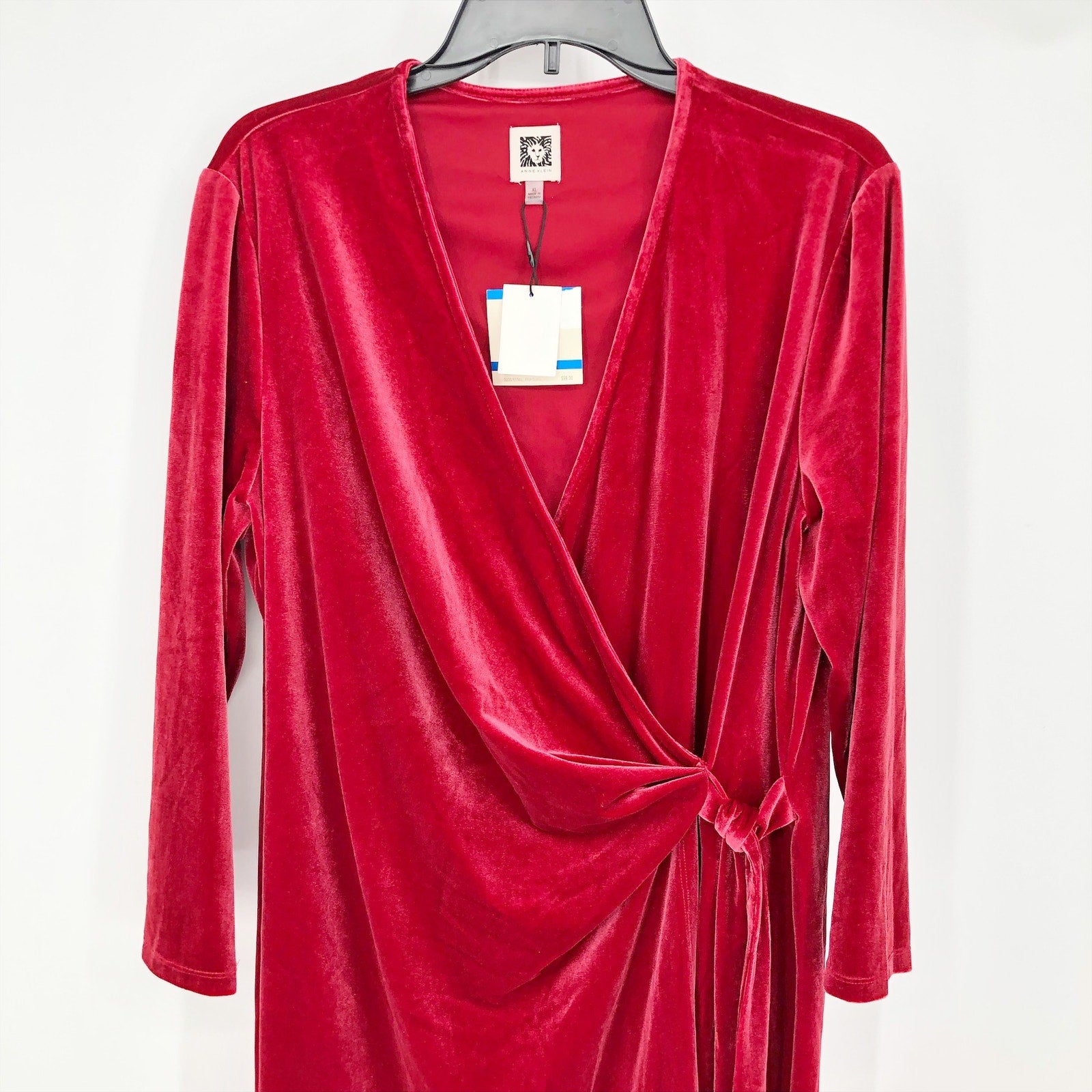 A luxurious look in smooth, soft velvet, this Anne Klein dress wraps around your silhouette with a waist-defining tie and a classic V-neck. Tailored fit through the chest, waist, and hips; sits close to the body