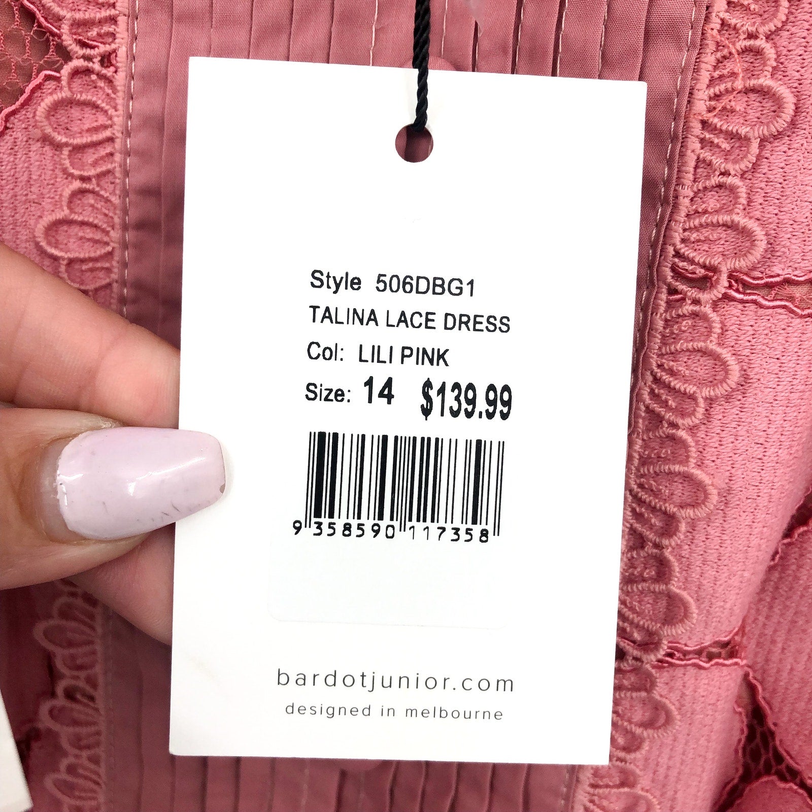 BARDOT JUNIOR Girl's Talina Lace Trim Dress Size 14 Lili Pink Long Sleeves NWT