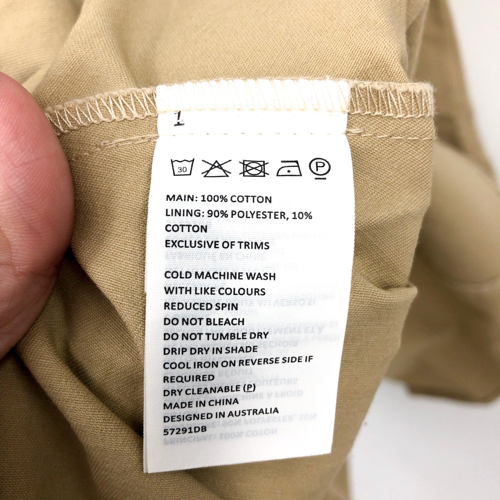 100% Cotton. Lining: 90% Polyester 10% Cotton