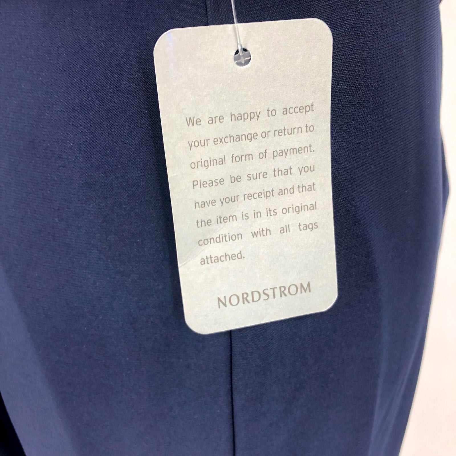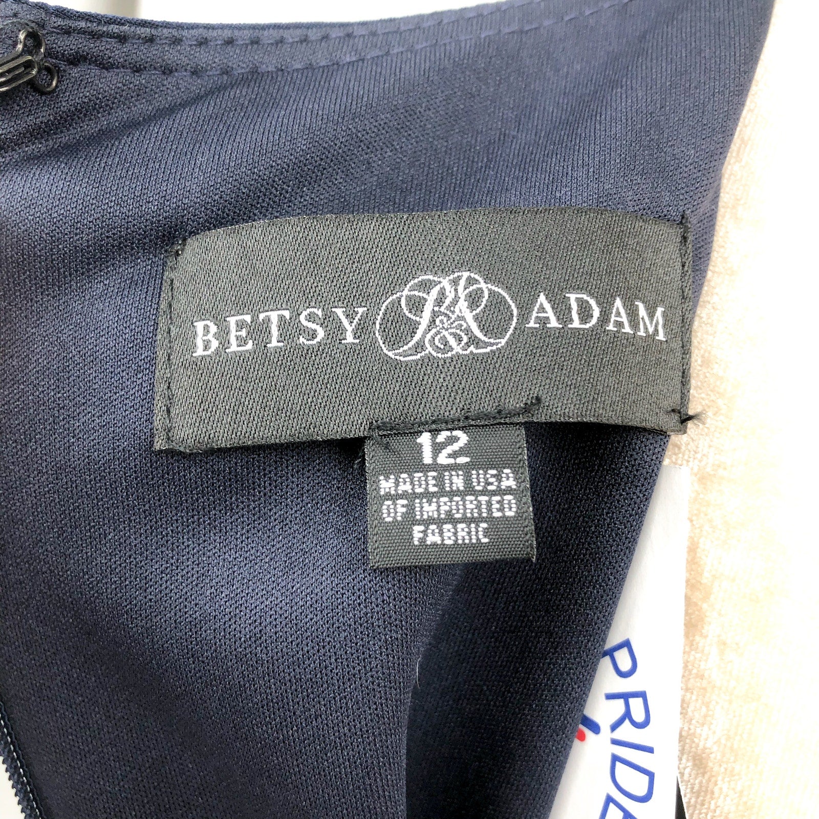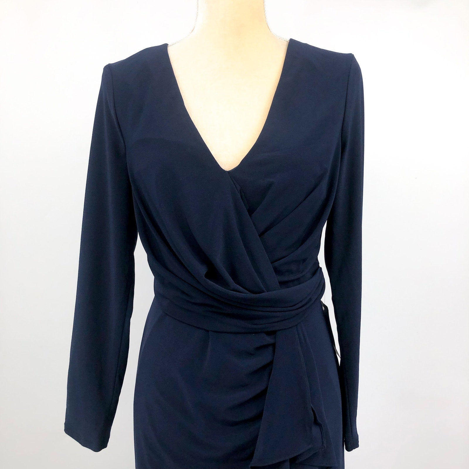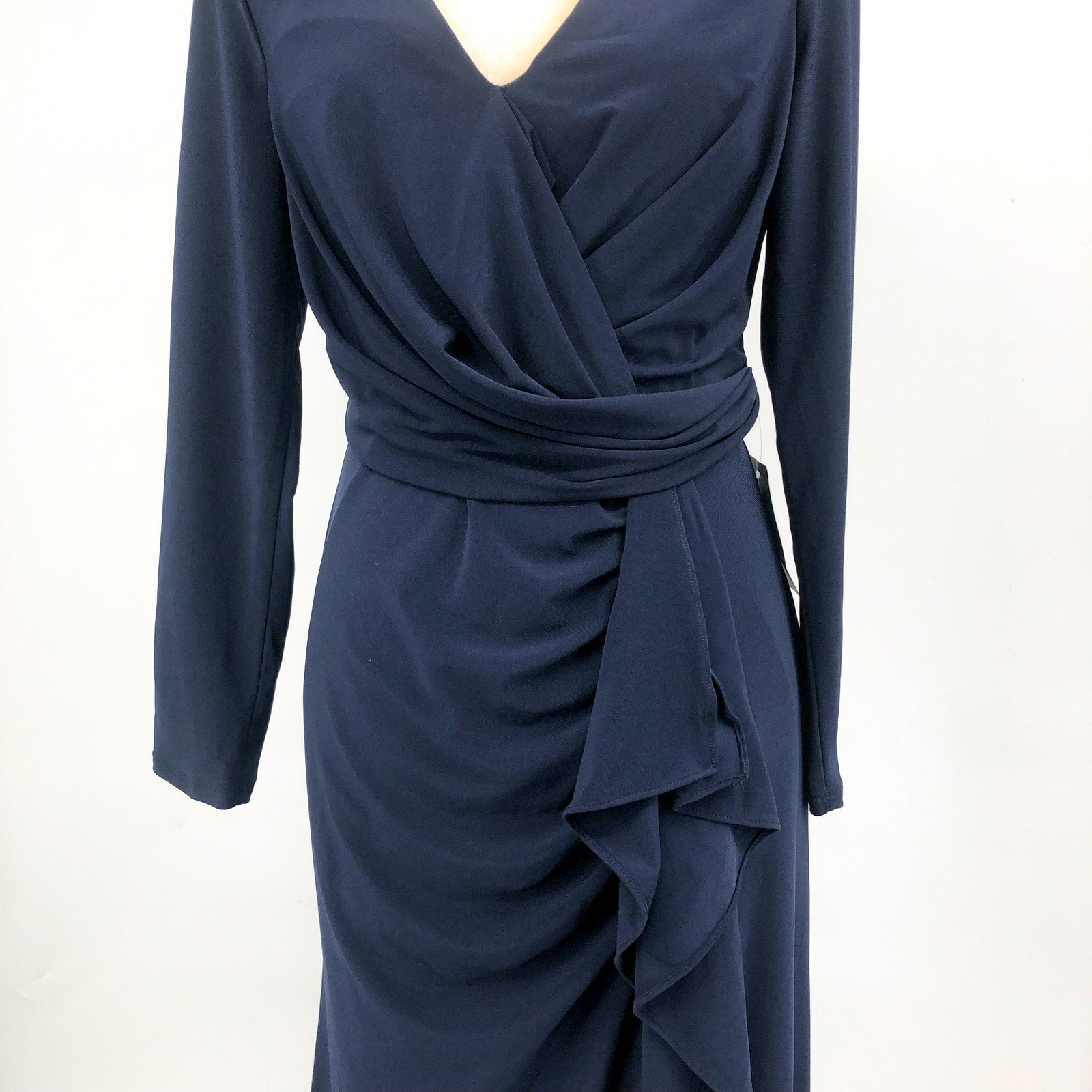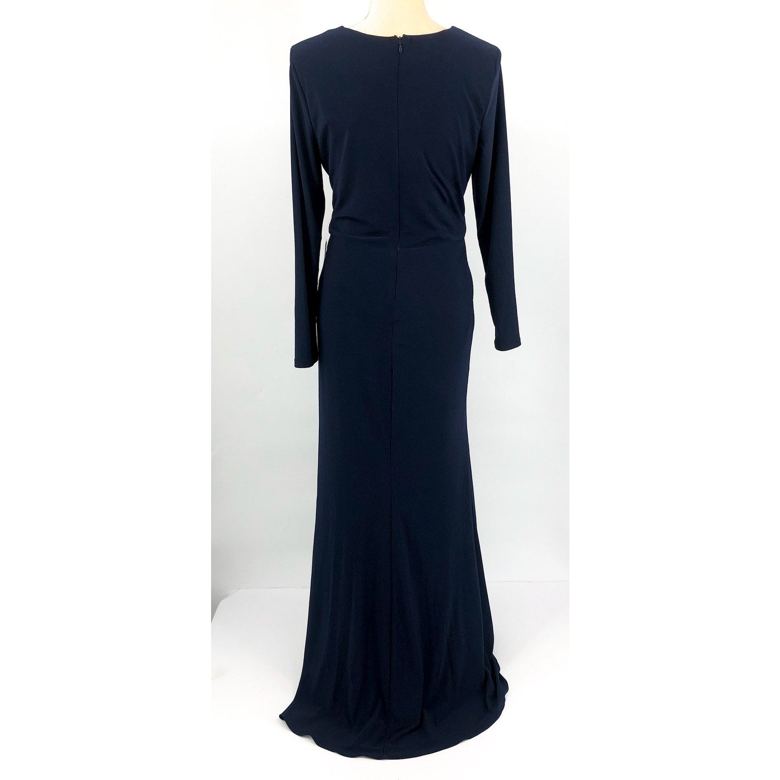 BETSY & ADAM Elle Gown Size 12 Navy Blue Long Sleeve Side Ruffled Slit NWT