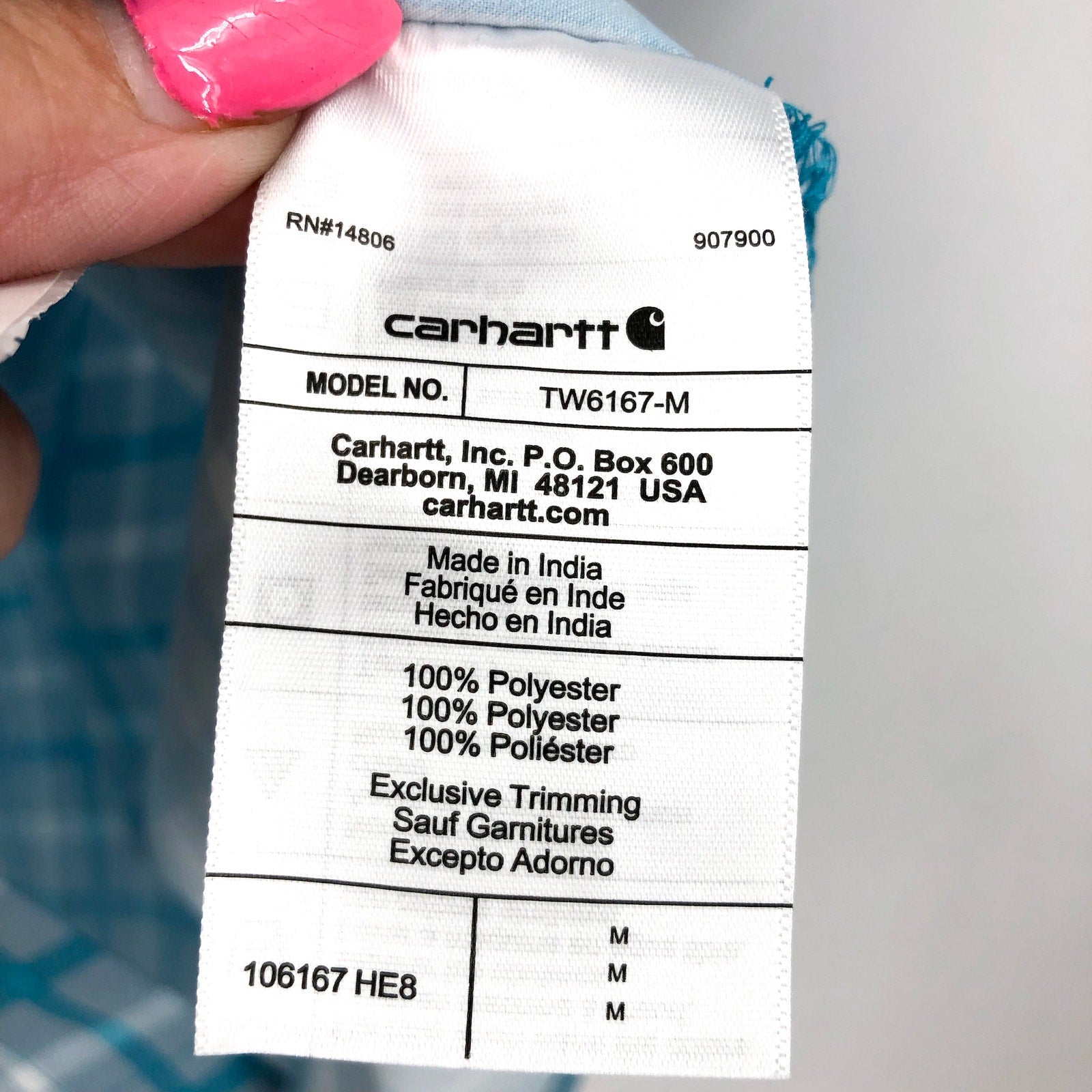 - Left-chest pocket with button closure and Carhartt label