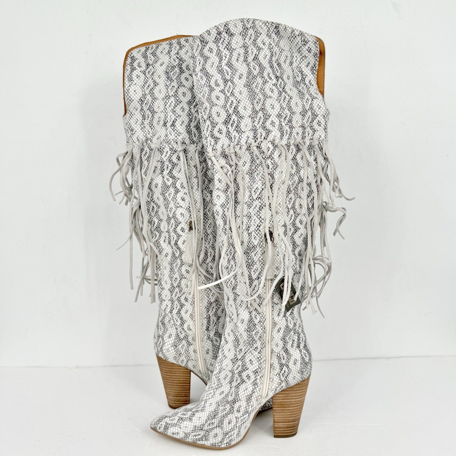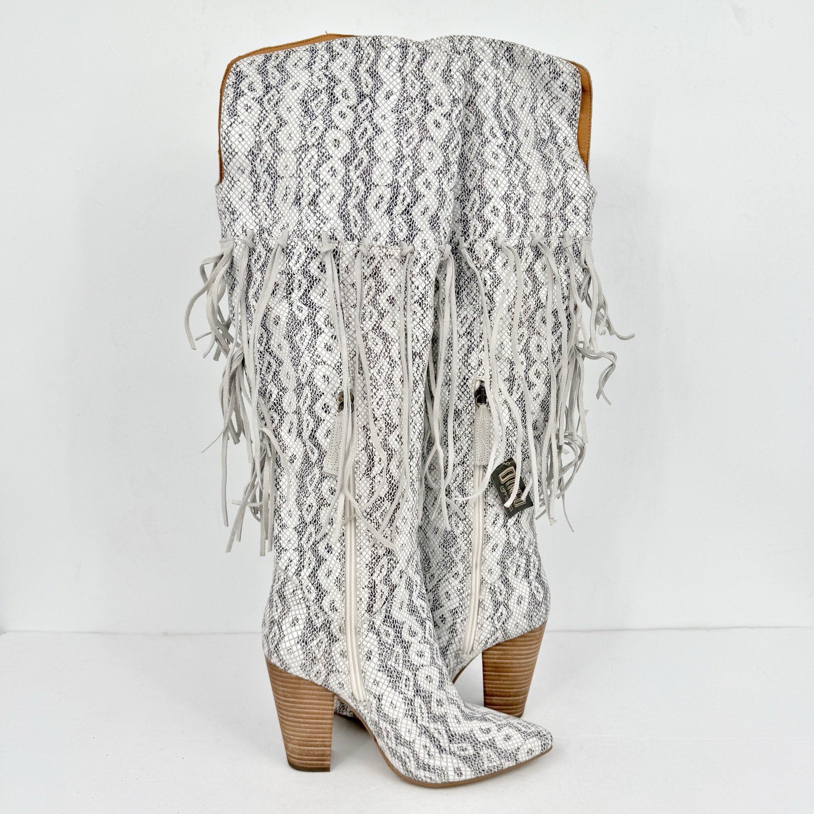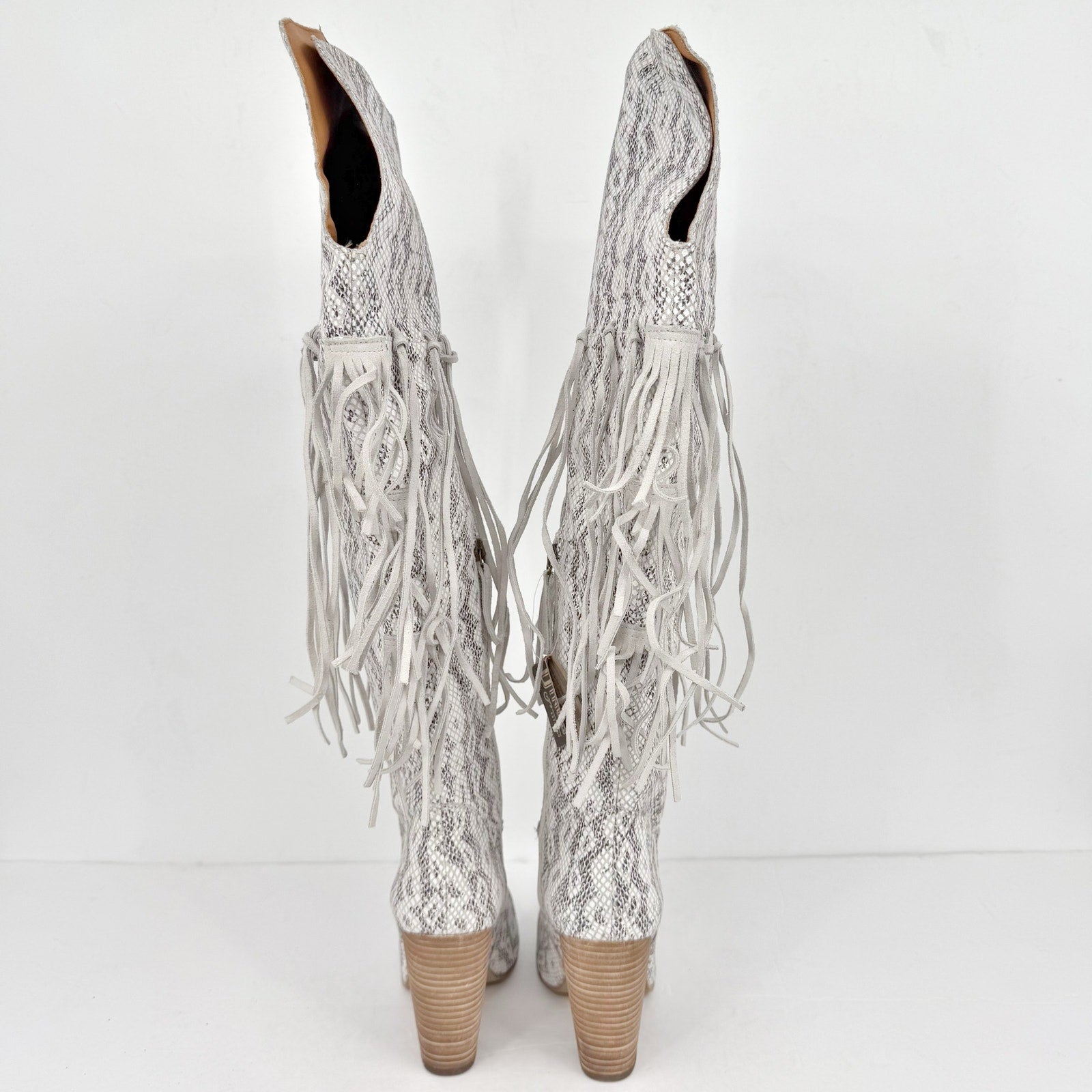 DINGO Womens Kitty Kat Fringe Snake Snip Toe Cowboy Boots US 8.5M White