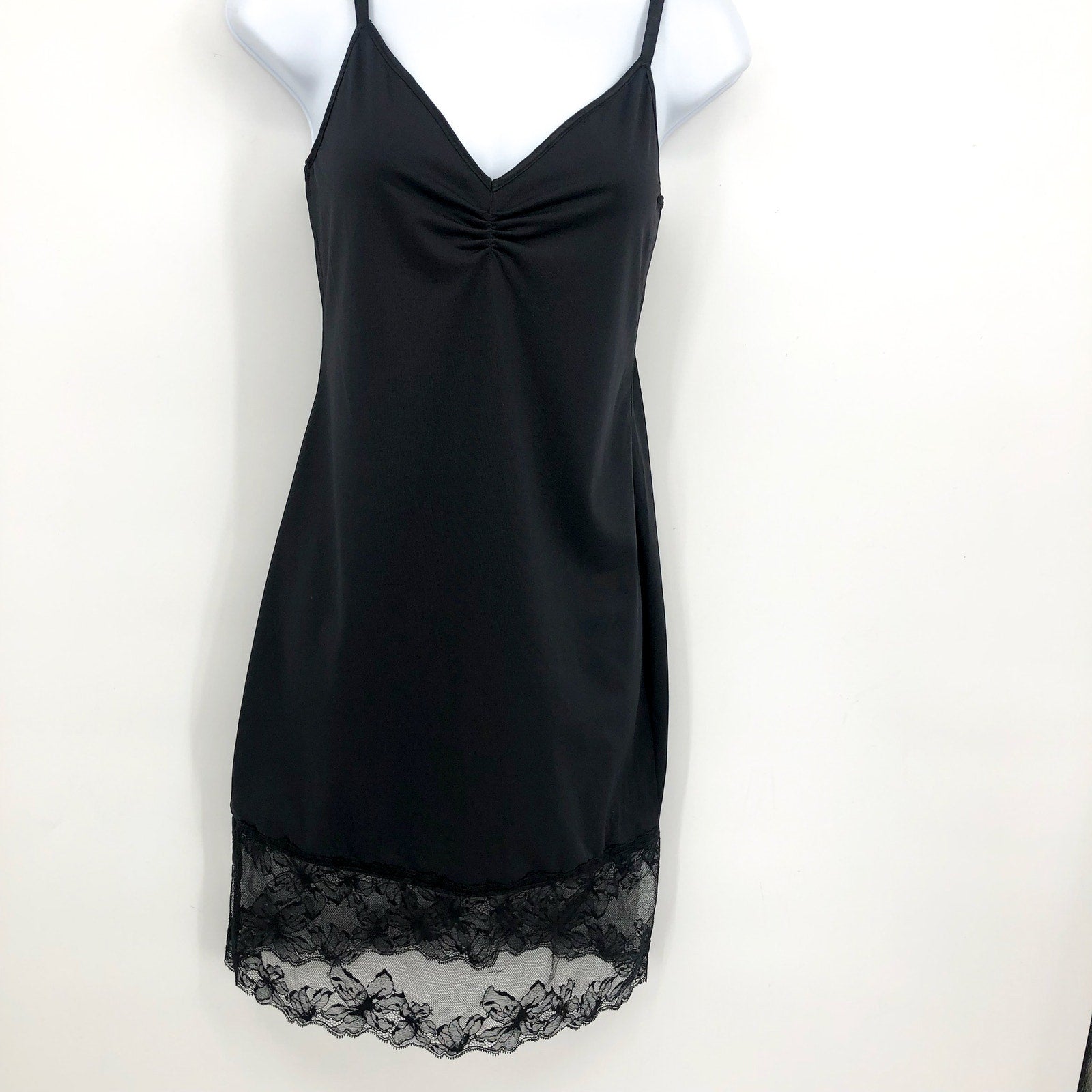 Little black slip. Our Orchid Lace Trim Slip is cut from ultra-flattering stretch jersey shapes to your body. Form-fitting with ruched detail at front. Orchid lace at the hem to amp up the sex appeal. Layer over your favorite Essentiels panty for a chic look that works from the bar to the bedroom.