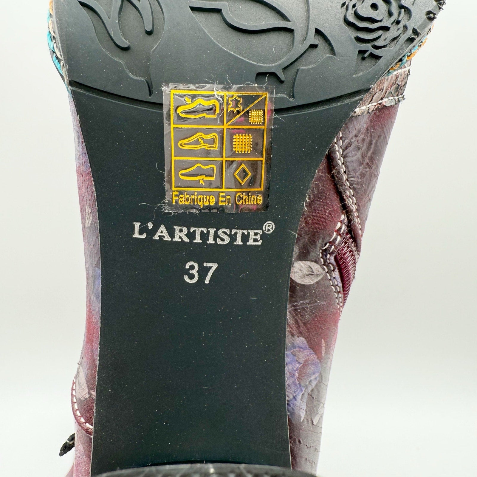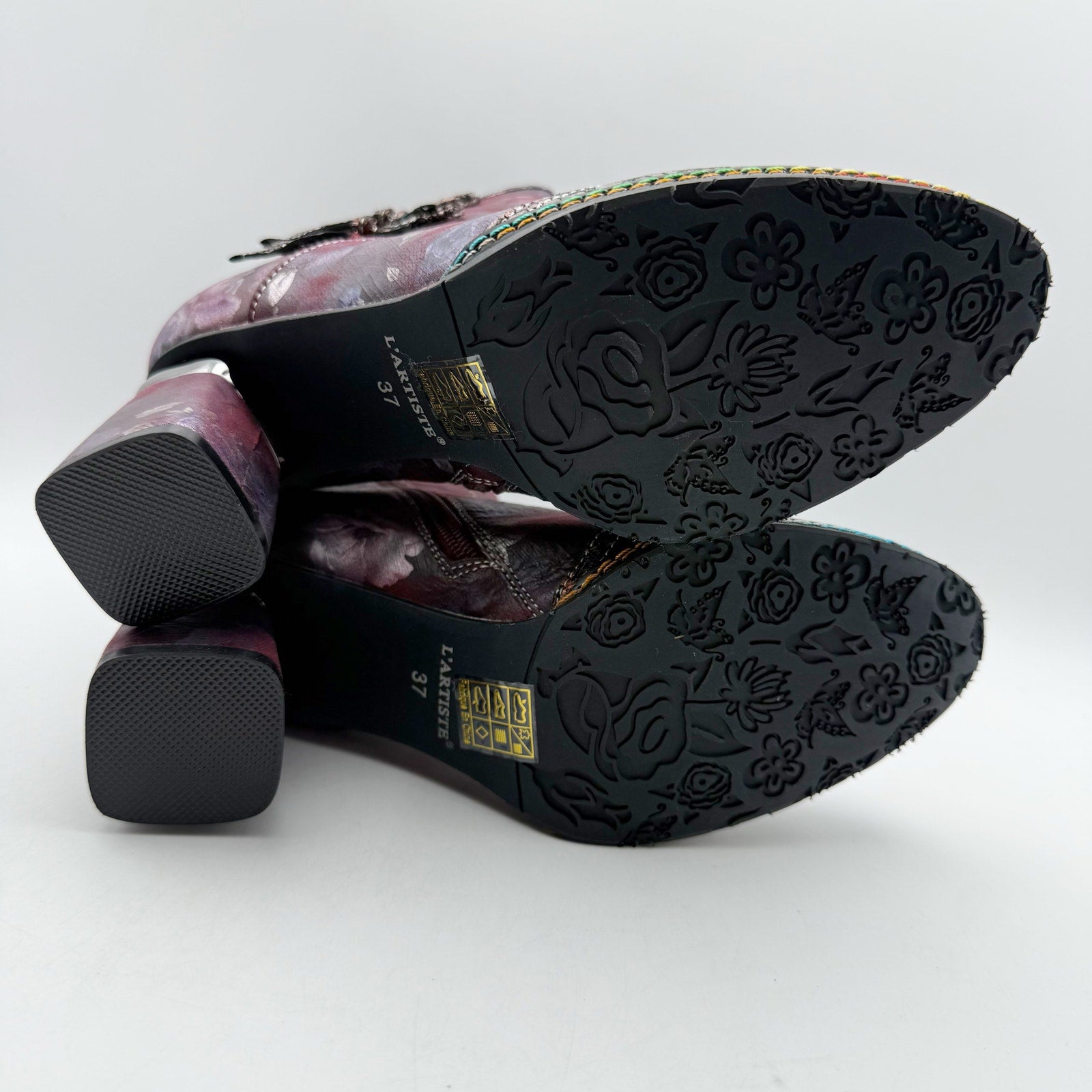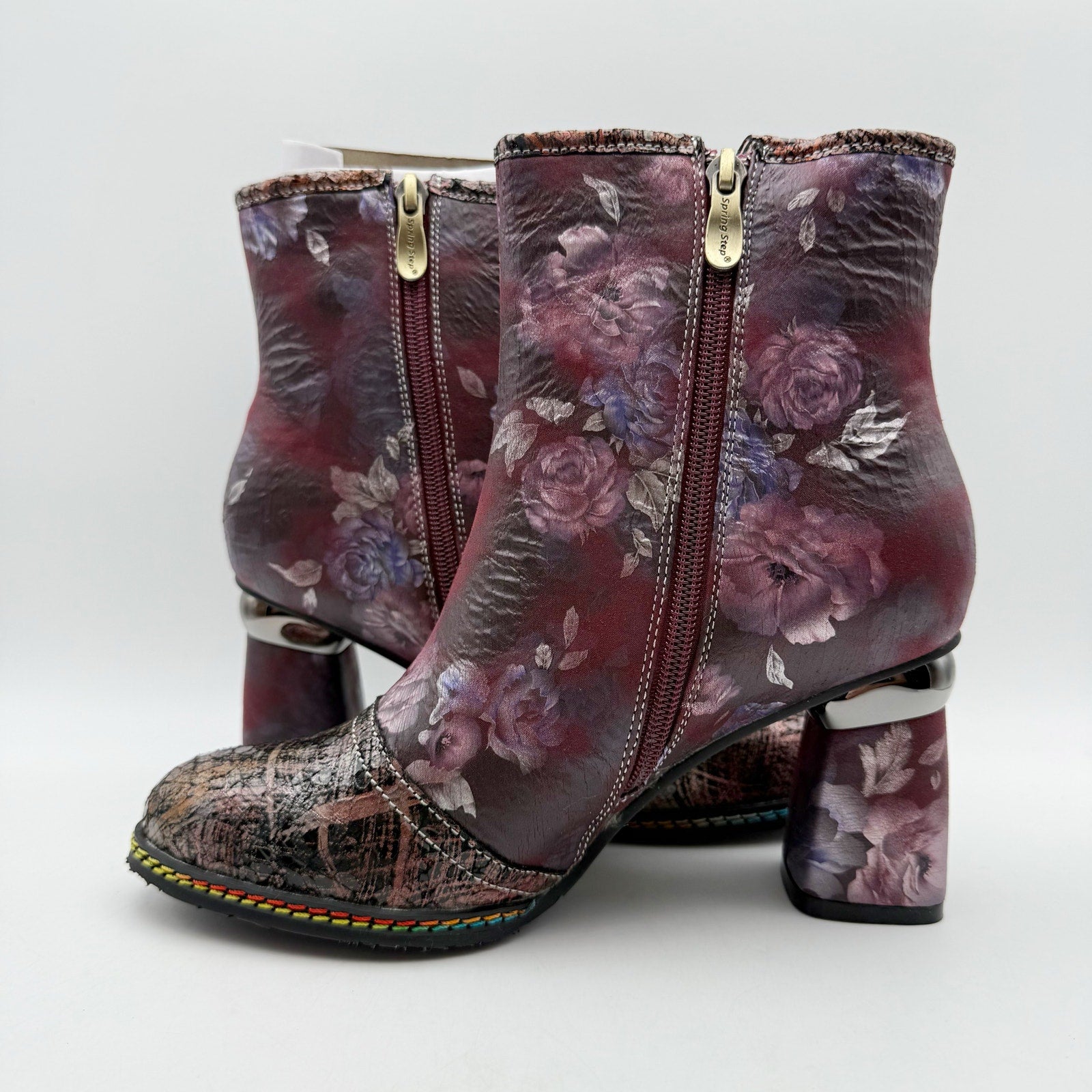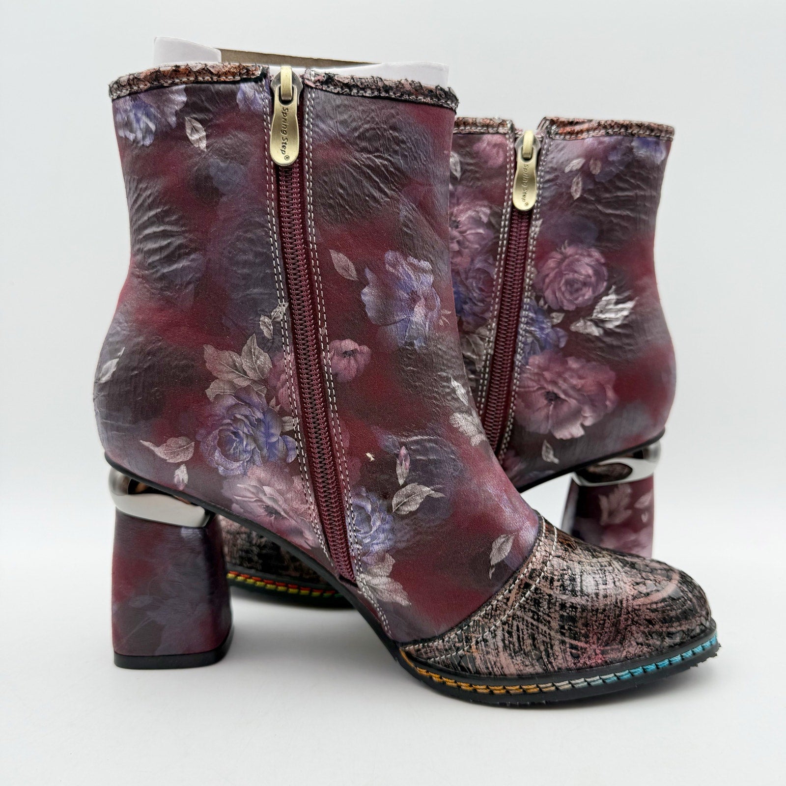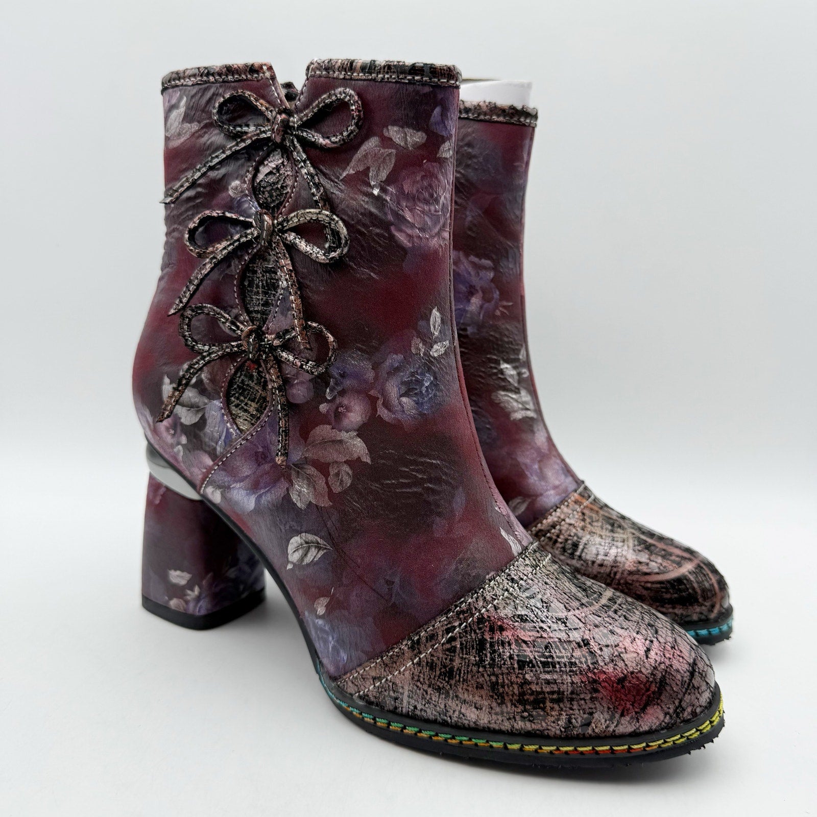 Sophistication meets style with this chic L'Artiste by Spring Step® Carre booties! The pop of multi-colored metallic blends together perfectly with beautifully printed floral designs. The floral-printed wrapped heel seamlessly complements the upper design, creating a stunning visual appeal. A sleek metallic cap toe design that adds a touch of glamor. Three decorative ribbons adorn the outside, adding a unique and playful twist.