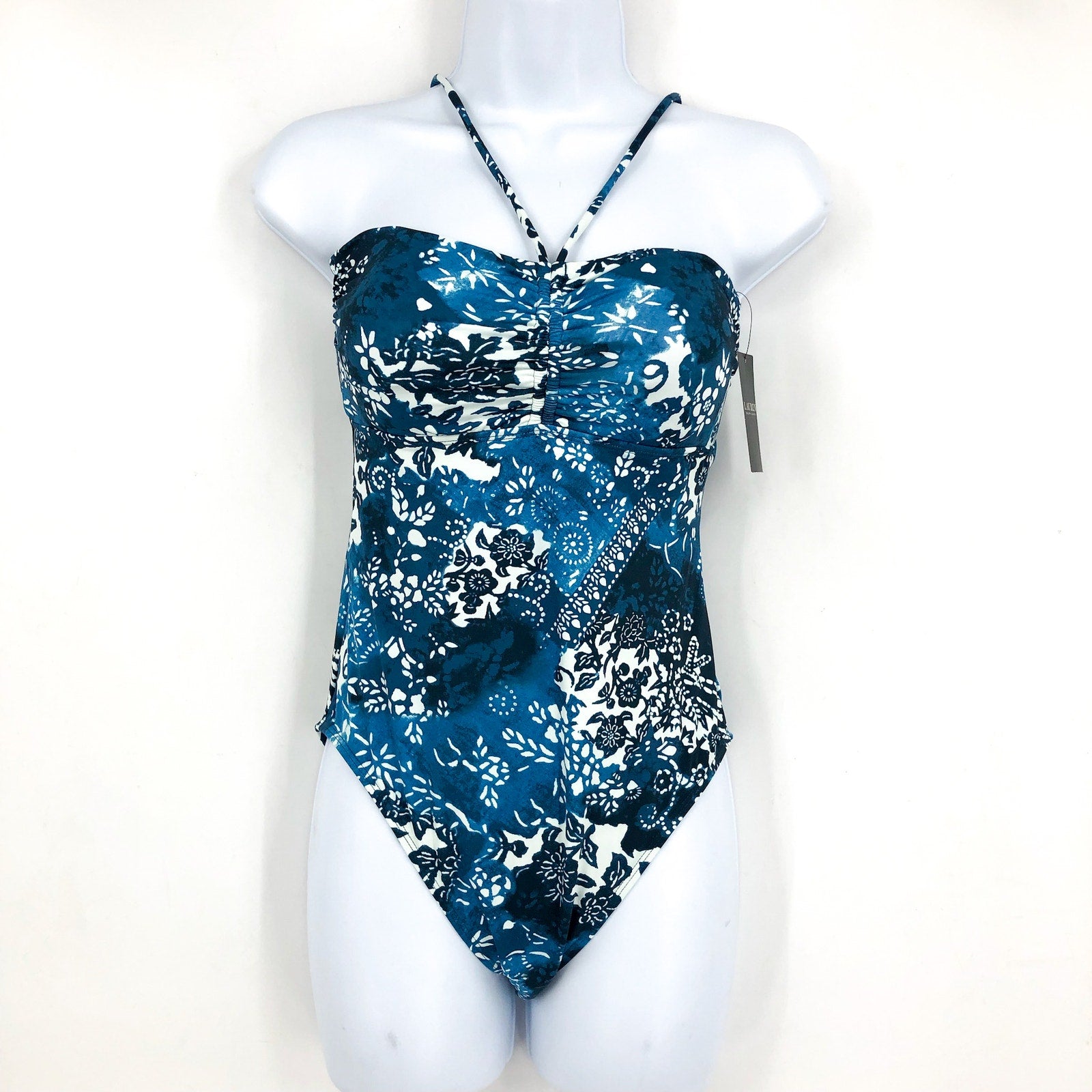 LAUREN RALPH LAUREN Halter Bandeau One Piece Swimsuit 10 Blue Patchwork NWT