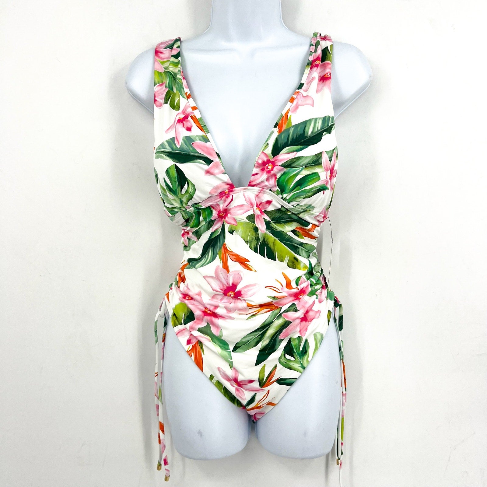 LAUREN RALPH LAUREN Plunge One Piece Swimsuit 6 White Watercolor Floral NWT