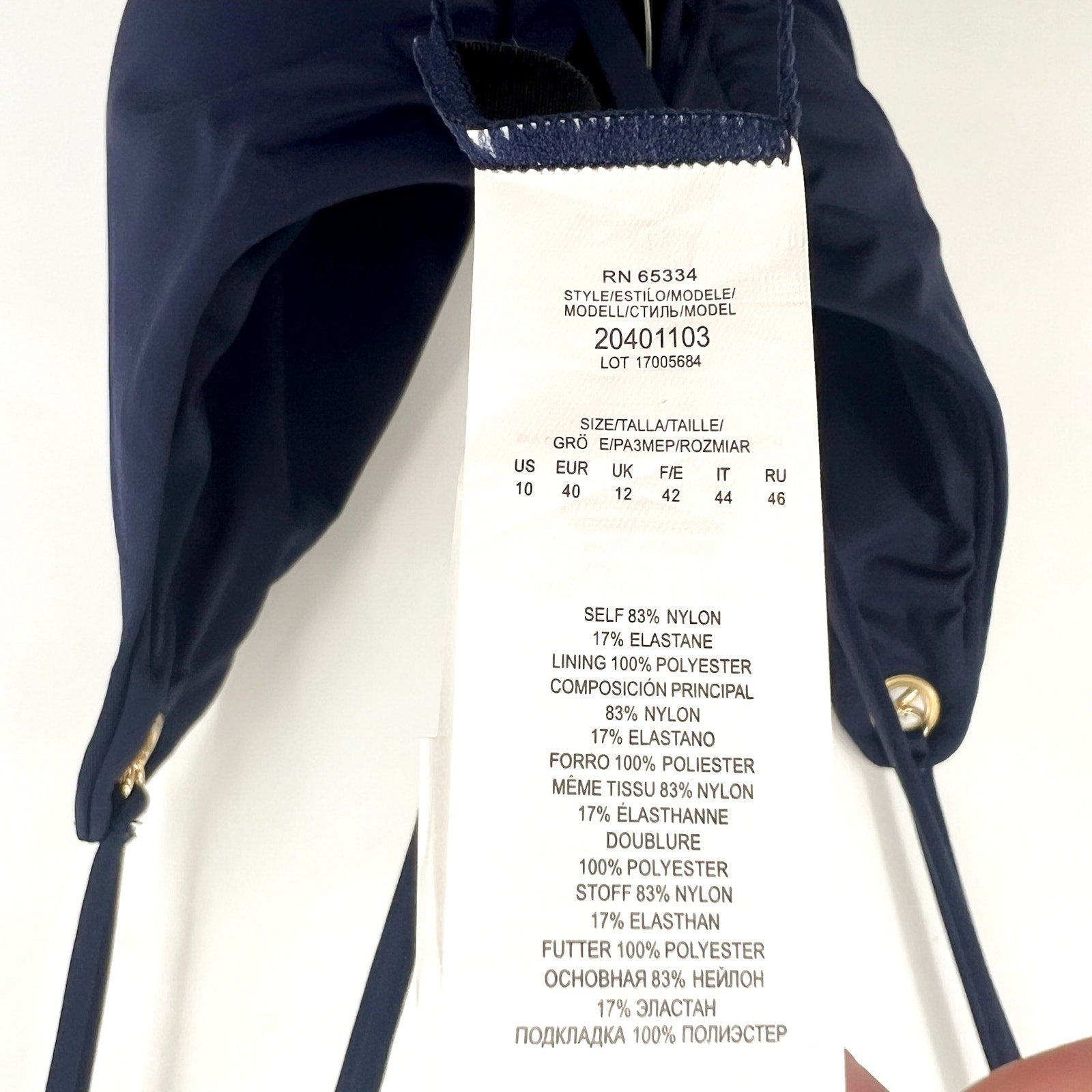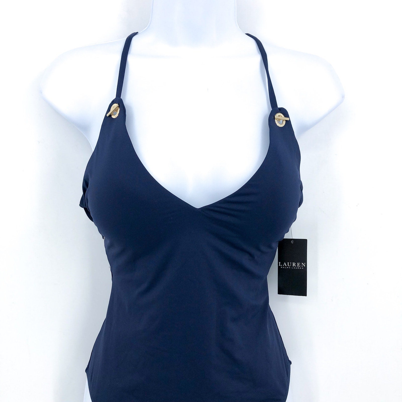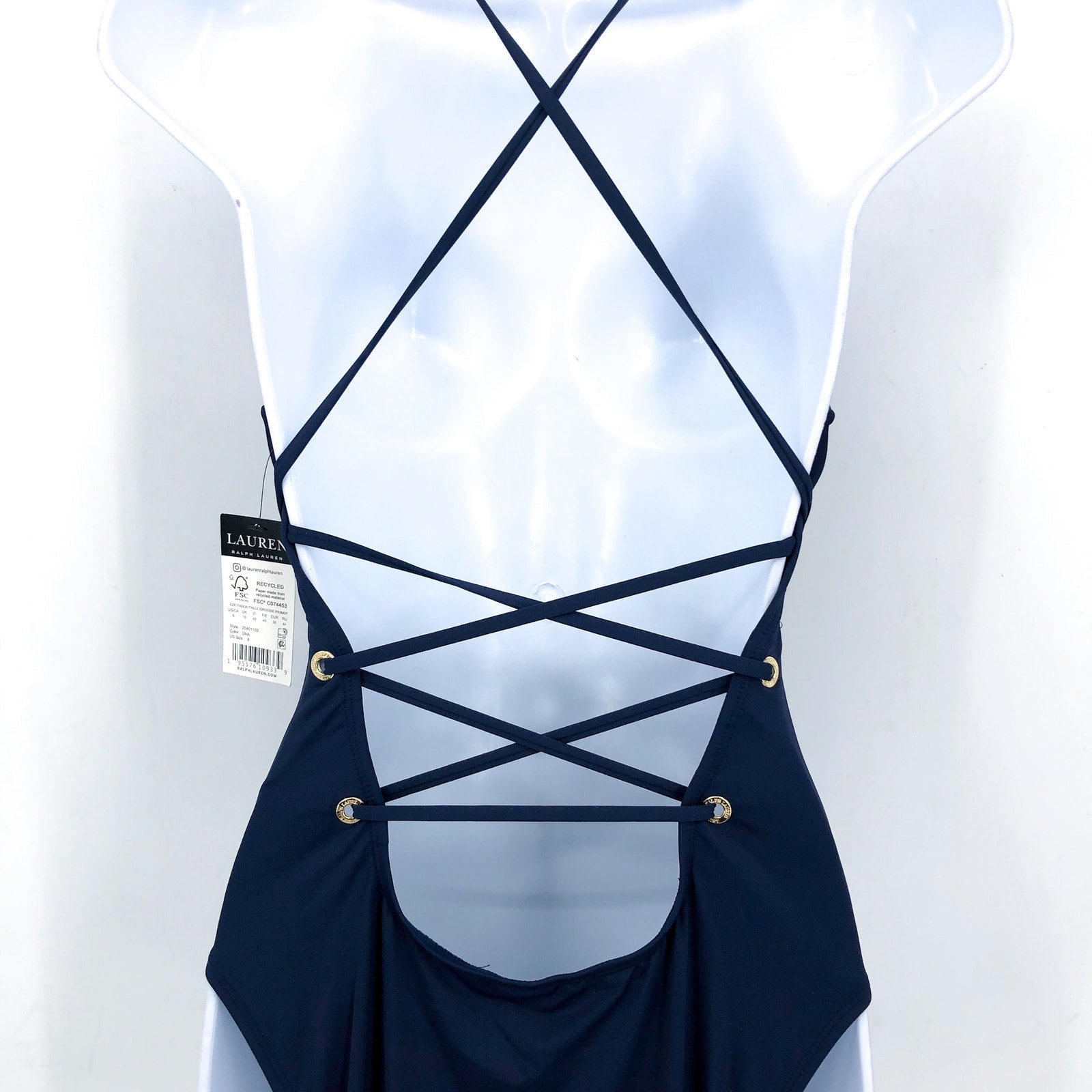 LAUREN RALPH LAUREN Strappy Plunge One-Piece Swimsuit Size 10 Blue Vneck NWT