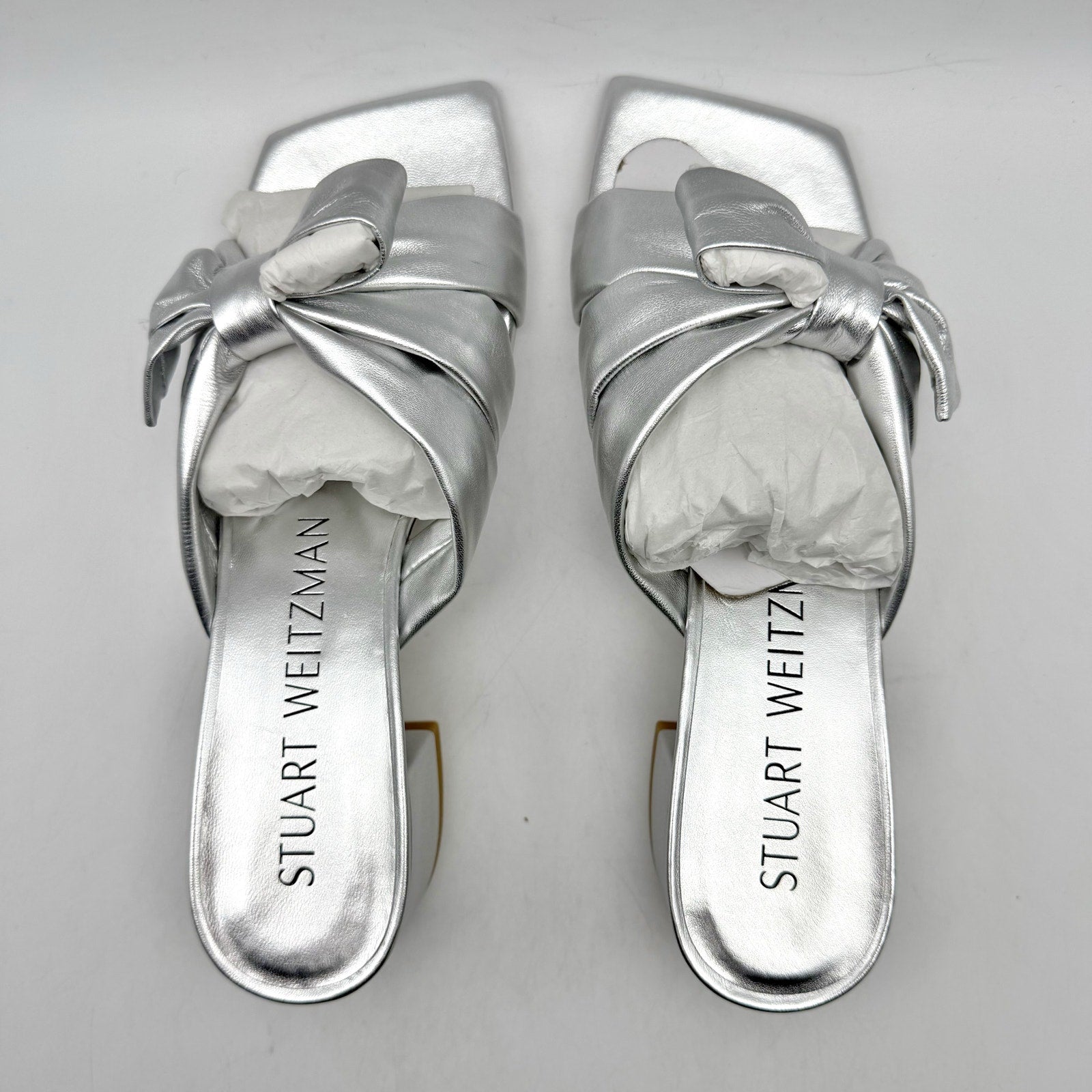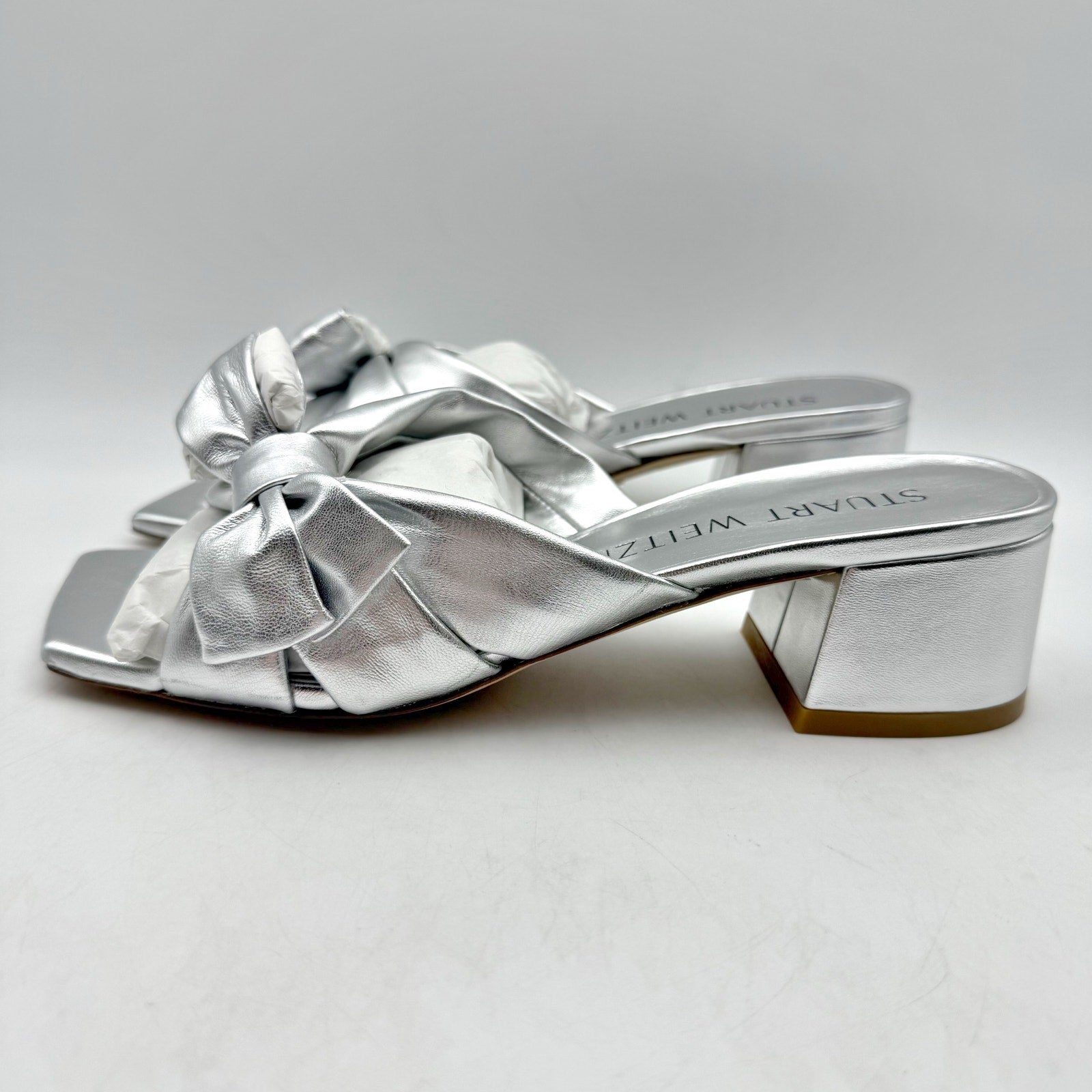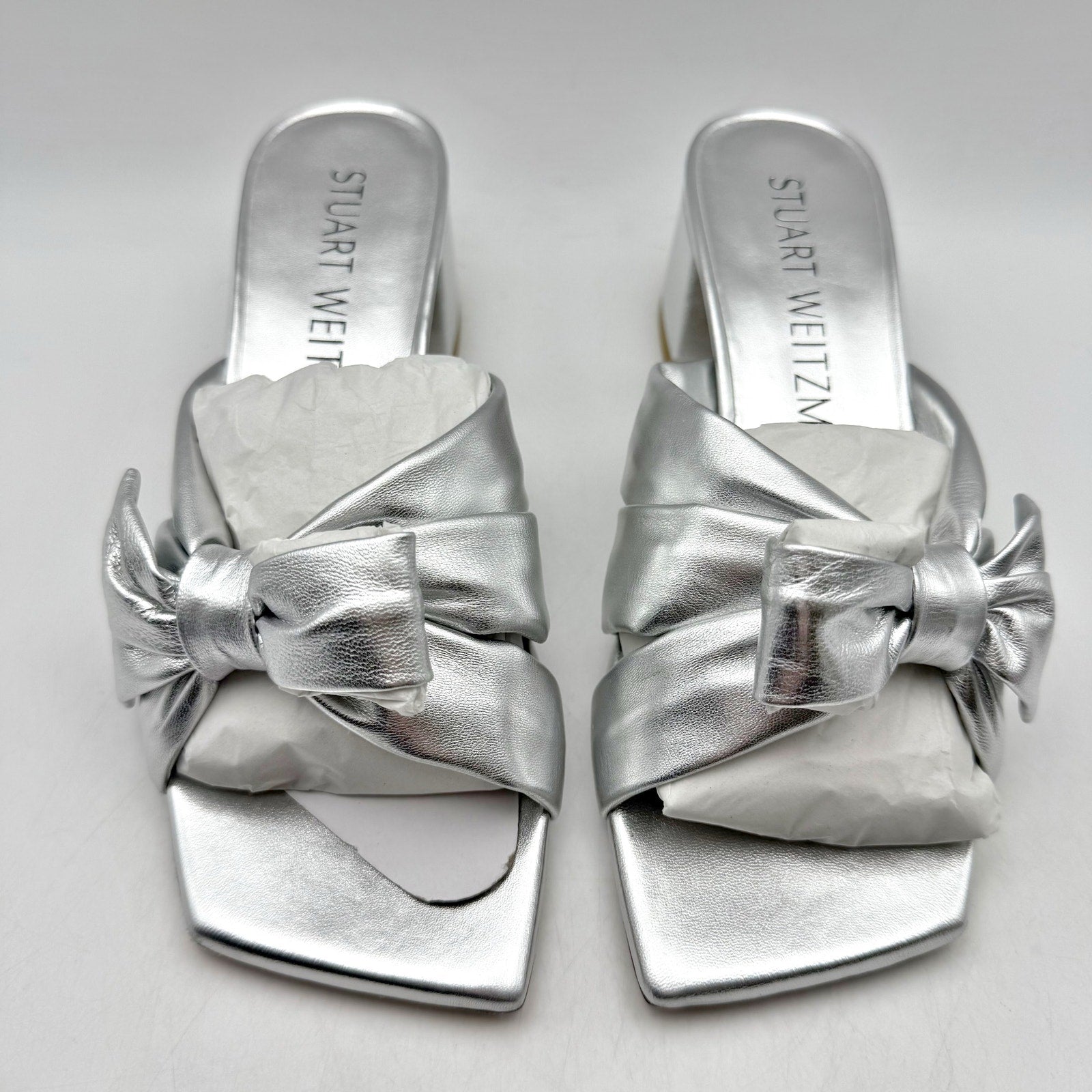 Stuart Weitzman Womens Sofia 45 Slide High Heels Size 6 Silver Leather Bow NIB